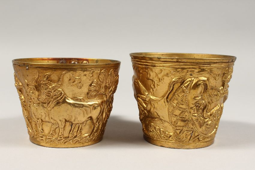A PAIR OF GREEK TWO HANDLED GILT CUPS. 4ins diameter.
