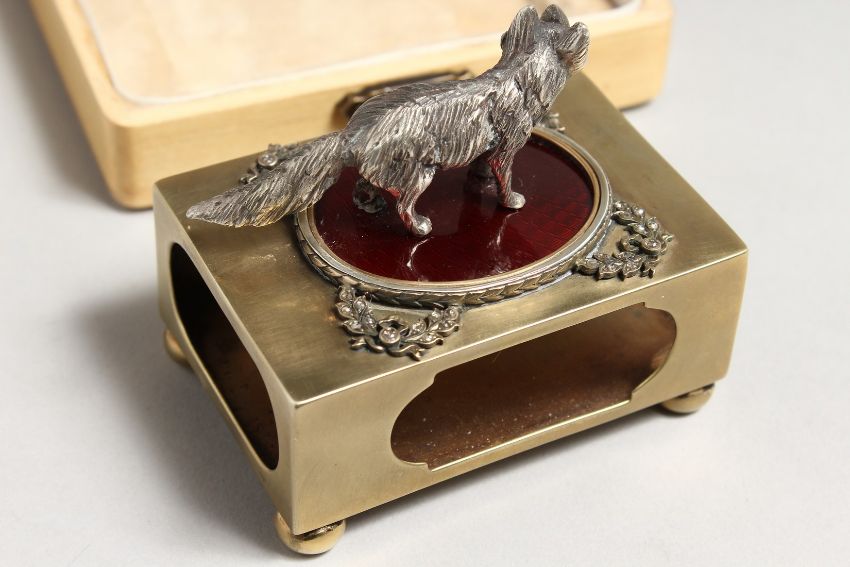 A SUPERB RUSSIAN SILVER GILT, ENAMEL AND DIAMOND SET MATCHBOX HOLDER, with enamel oval and silver fox, on ball feet.