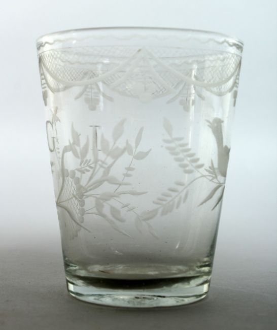 AN EARLY GLASS BEAKER engraved with birds and flowers and initial I G.
