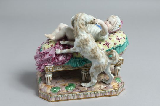A GOOD 18TH CENTURY MEISSEN PORCELAIN GROUP a baby on a bed playing with a dog.