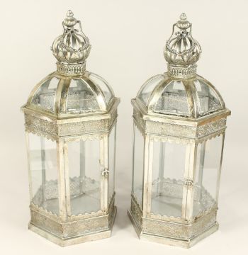 A PAIR OF METAL AND GLASS HEXAGONAL LANTERNS.