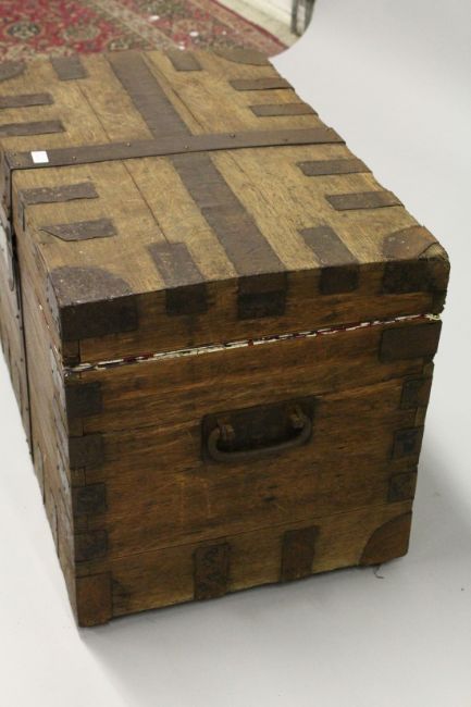 AN OAK AND IRON BAND SILVER CHEST, the front with applied brass owner's plaque for " Lord Alex Geo. Russell, Rifle Brigade I".