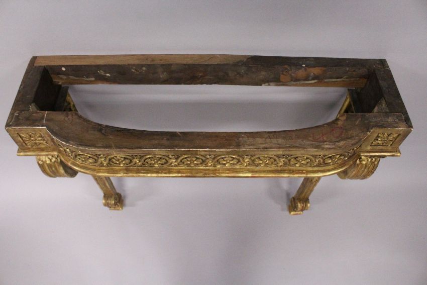 A GOOD 19TH CENTRUY MARBLE AND CARVED GILTWOOD CONSOLE TABLE with a bow fronted top, floral and scroll carved frieze on similar supports.