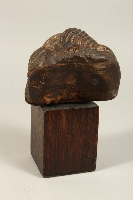 A 17TH CENTURY CARVED LIMEWOOD CHERUB'S HEAD on a stand.