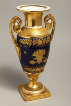A 19TH CENTURY PARIS PORCELAIN TWO HANDLED VASE having a cobalt blue ground with etched gilded decoration.