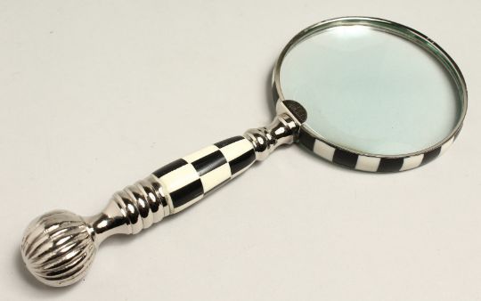 A MAGNIFYING GLASS WITH CHECKERED AND CHROME HANDLE.