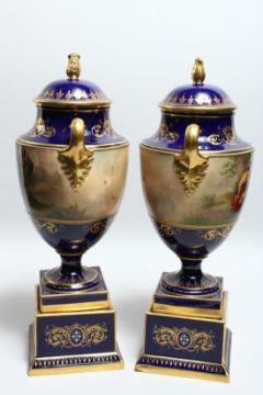 A SUPERB LARGE PAIR OF 19TH CENTURY VIENNA URN SHPAED VASES, COVERS AND STANDS with rich blue ground and continuous painted scenes. Bendaldo v Aranida.
