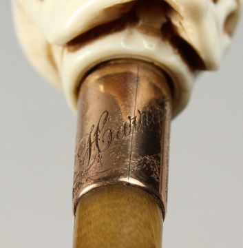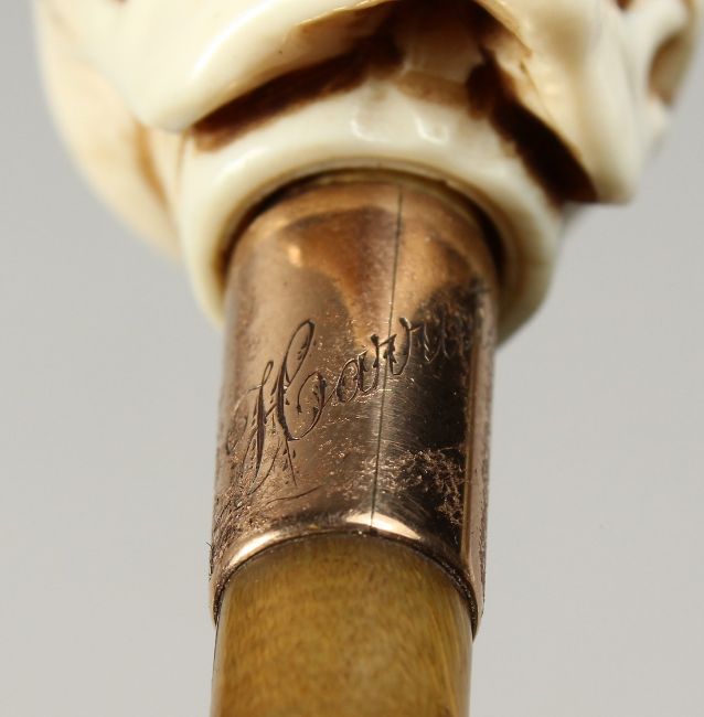 A RUSTIC RHINO PART RIDING CROP with carved ivory skull handle.