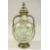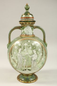 A GOOD CONTINENTAL TWIN HANDLED GLASS VASE AND COVER, decorated in the Medieval style, with enamelled figures in a garden setting, with gilded highlights.