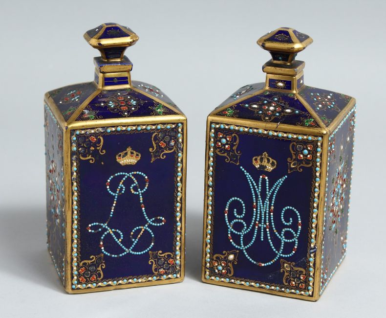 A NEAR PAIR OF 19TH CENTURY, SEVRES, FRENCH BLUE, PORCELAIN SQUARE BOTTLES AND STOPPERS with gilt bead work decoration.