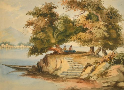 Attributed to Henry Maurice Page (19th Century), figures resting in a Continental port, watercolour, 8.25" x 11.5".