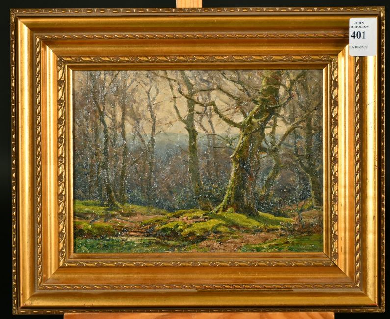 Frederick Golden Short (1863-1936) British, Trees in a winter wood with moss on the ground, oil on board, signed and dated, 6.75" x 8.75".