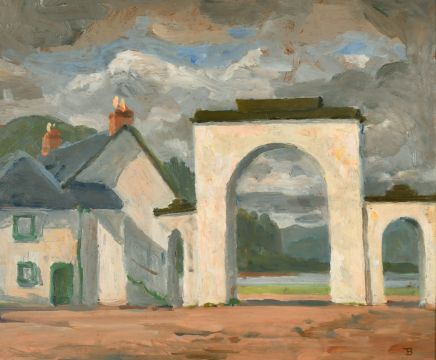 John Brown (20th Century) British, a view of buildings, oil on board, signed with initials, 10" x 12".