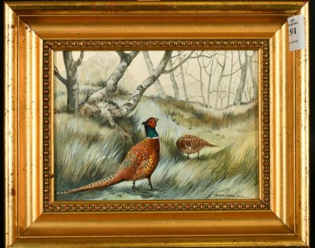 Berrisford Hill, pheasants in a woodland landscape, oil on panel, signed, 5" x 7".