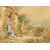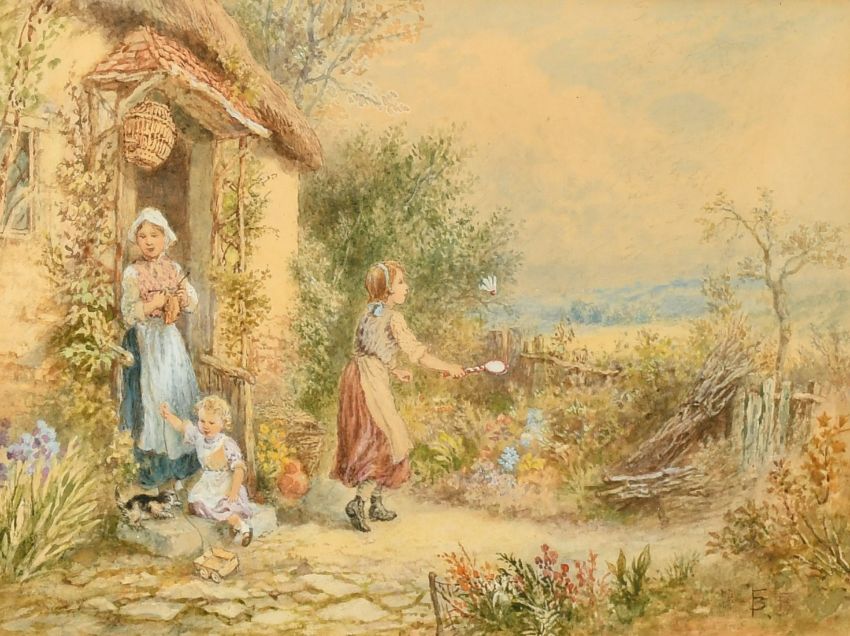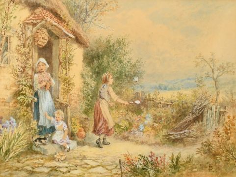 Circle of Myles Birket Foster, A family at a cottage door, watercolour, bears monogram, 4.75" x 6.75".