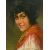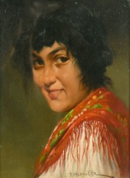 Franz Obermuller (1869-1917) Austrian, Portrait of a woman wearing a red, pink and green shawl, signed, oil on canvas, label verso, 7.5" x 6".