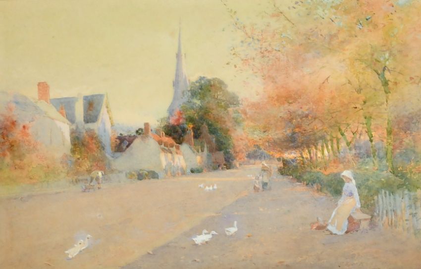 Thomas MacKay (1851-1909) British, 'Walkers, Harrogate', female figures with geese on a village road, watercolour, signed and dated, 8.25" x 12.5".