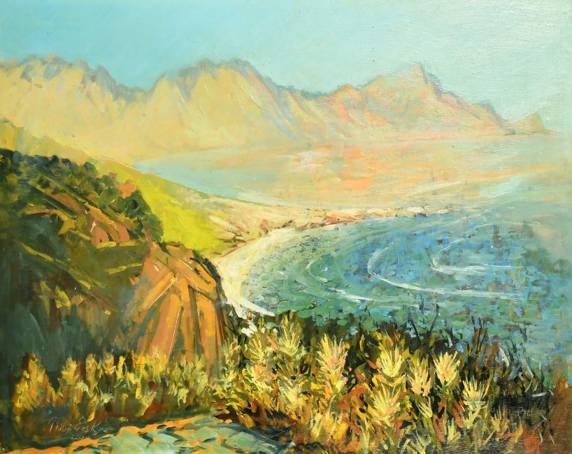 Philip Niel Erskine (1933-2013) South African, a view of a bay with mountains beyond, oil on board, signed, 30" x 39".