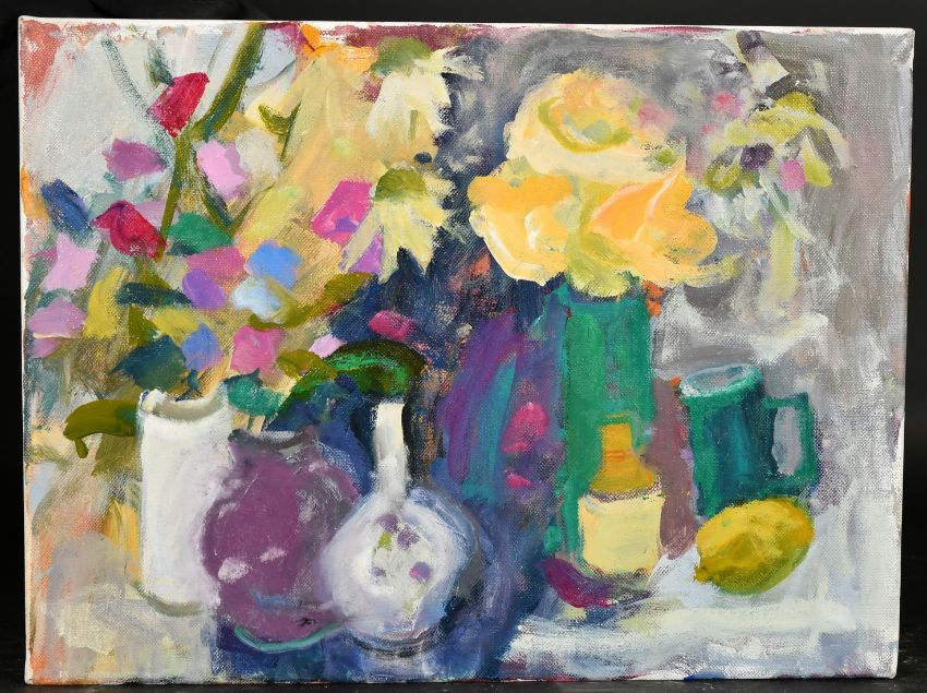 Sheila Macnab Macmillan (1928-2018) Scottish, A still life of colourful flowers in vases, oil on canvas, inscribed verso, 12" x 16".