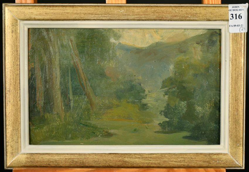Early 20th Century, two plein air oil sketches, one 5" x 8", the other 4" x 9" (2).