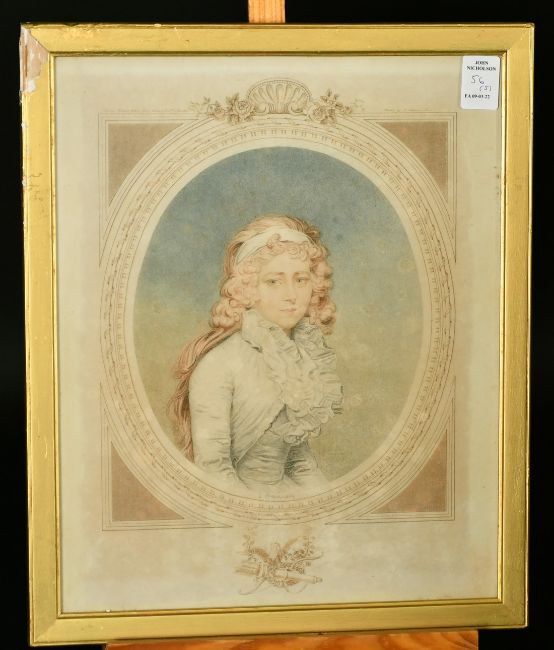 After John Downman (1750-1824) Five coloured lithographs, Portraits of ladies, published 1908 and 1909, 4 with trade labels verso, largest being 11" x 8.25", Provenance: Henry Graves & Co; Ltd. (5).