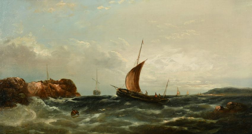 W.H. Williamson (1820-1883) British, Sailboats in choppy sea, oil on canvas, signed and dated 1882, with inscription verso, 10" x 18".