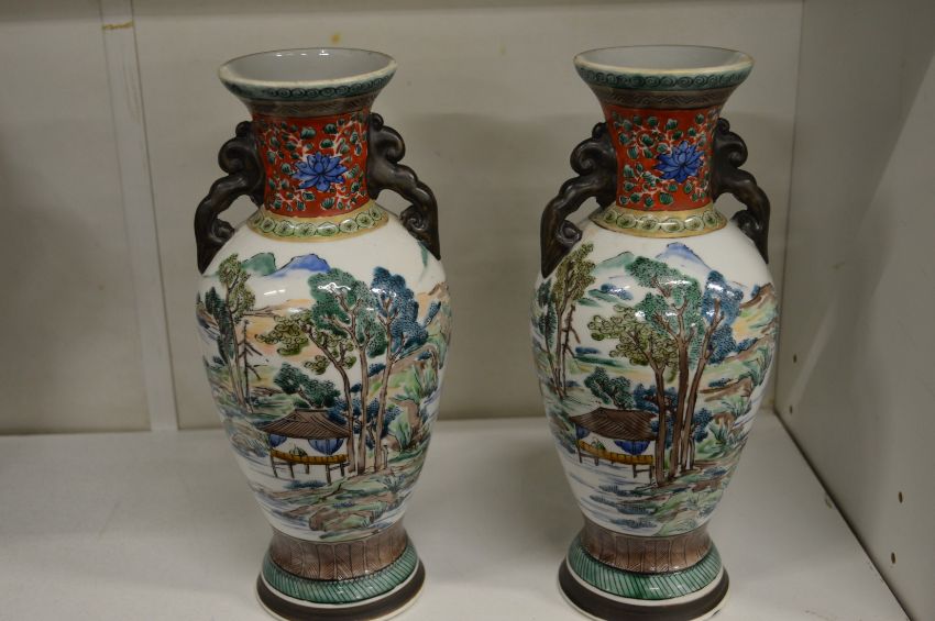 A pair of Chinese baluster shaped vases painted with landscapes.