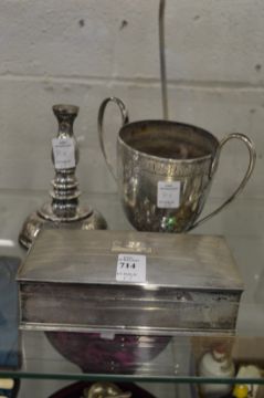 A silver cigarette box together with a presentation cup (AF).