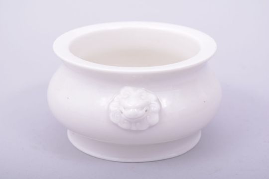 A BLANC DE CHINE PORCELAIN CENSER, with twin lion form handles, 15cm diameter.