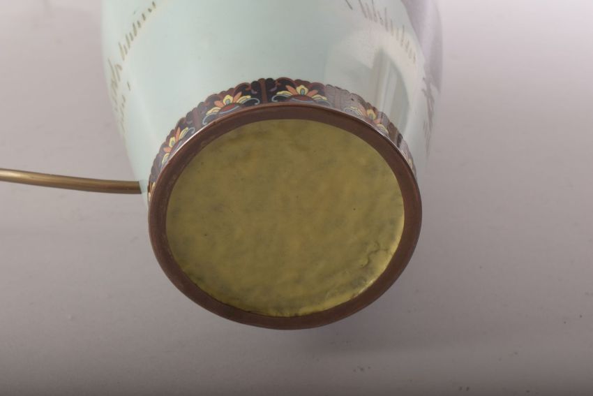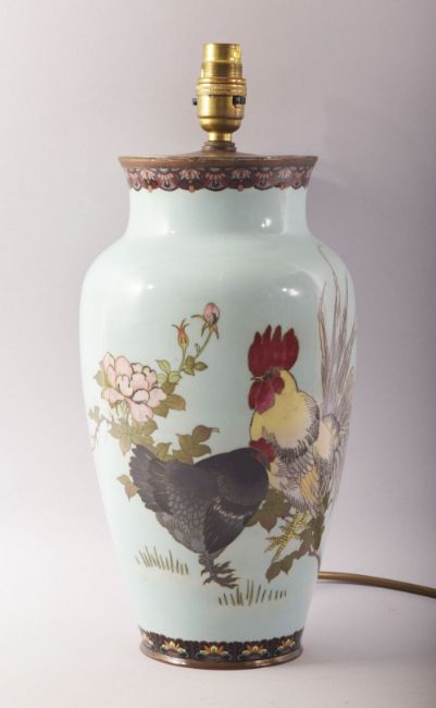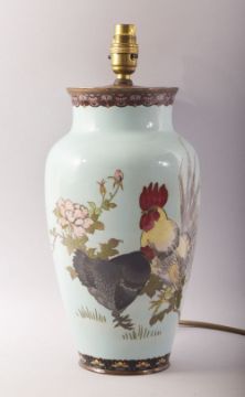 A GOOD CHINESE PALE BLUE GROUND CLOISONNE COCKEREL LAMP, the body decorated with a rooster and hen amongst native flora, 39cm high overall.