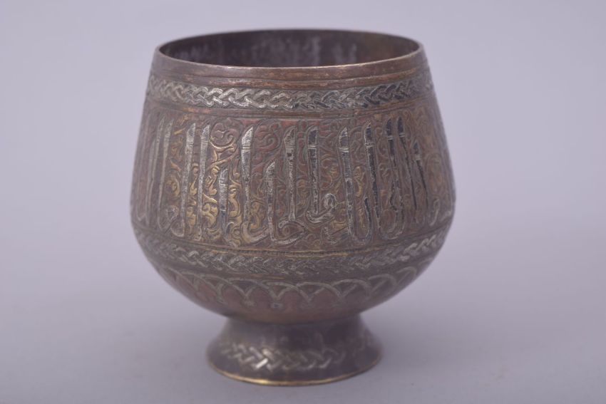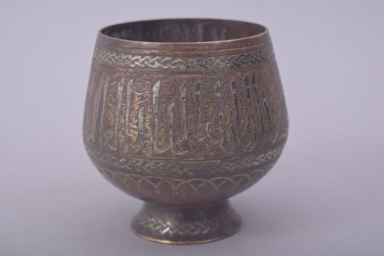 A FINE ISLAMIC SILVER INLAID BRASS GOBLET, decorated with a band of calligraphy, 8.5cm high.