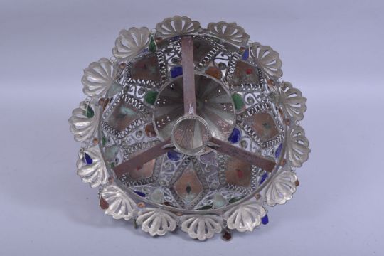 A LARGE 19TH / 20TH CENTURY MOROCCAN WHITE METAL AND CERAMIC CALLIGRAPHIC LAMP, the filigree style mountings encapsulating the decorated ceramic body, with floral and calligraphic design, further decorated with teardrop bone and moon shaped exotic timber, the shade with openwork and inset glass teardrop decoration, the top with a bakelite finial, fitted for electricity but not tested, 100cm high.