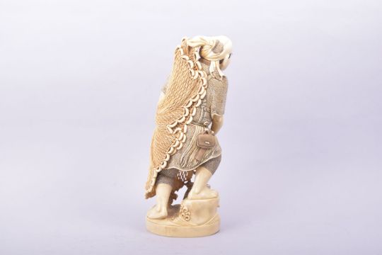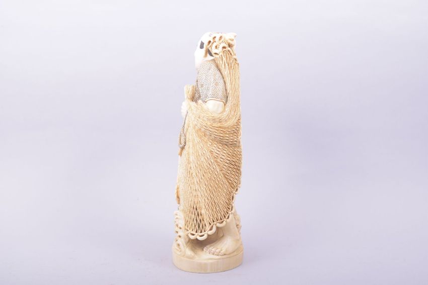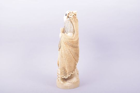 A GOOD LARGE CARVED IVORY FIGURE OF A FISHERMAN, the figure stood upon a carved wave base holding a pierced fishing net with a basket at his feet, with incised seal mark to base, 29cm high.