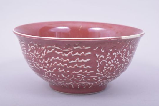 A CHINESE COPPER RED GLAZE BOWL, the exterior with raised decoration depicting dragon, phoenix and flowers, with six character mark to base, 20.5cm diameter.