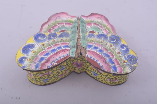 THREE 19TH CENTURY CHINESE CANTON ENAMELLED ITEMS, comprising of a butterfly form box, another small box and a small dish (3).