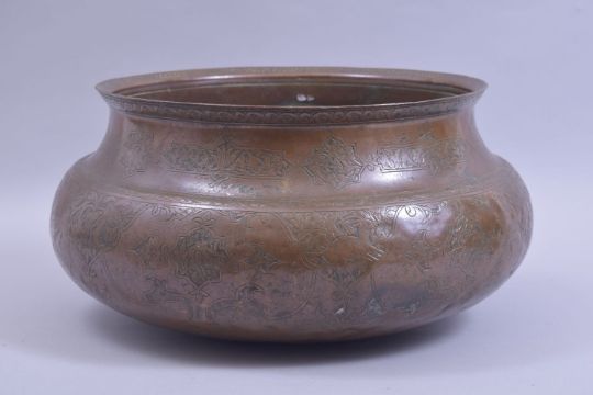 A LARGE ISLAMIC / PERSIAN ENGRAVED BRONZE BOWL, with panels of animals and flora, 38cm diameter.