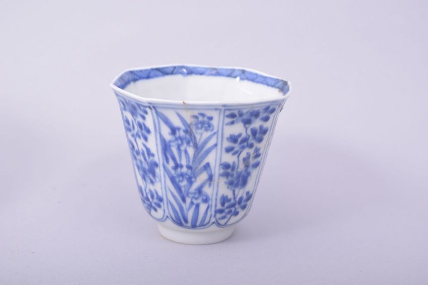 A MIXED LOT OF FIVE CHINESE PORCELAIN ITEMS, comprising three blue and white tea bowls, a small blue and white dish and a small famille rose vase, (af), (5).