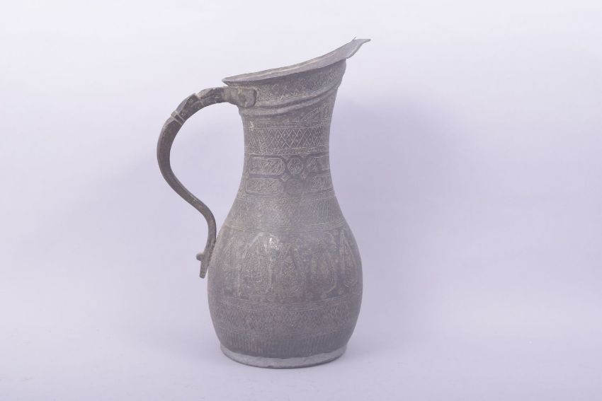 AN ISLAMIC ENGRAVED METAL EWER, 30cm high.