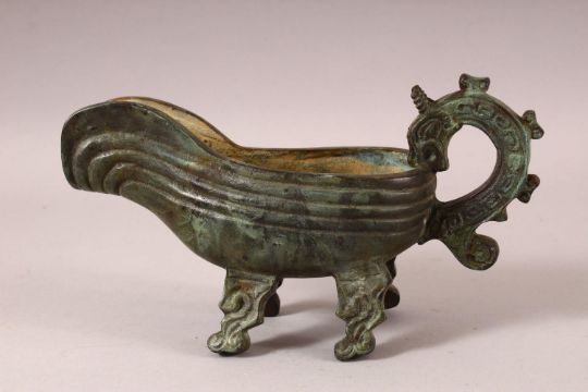 A CHINESE ARCHAIC STYLE TWIN HANDLE LIBATION CUP - with archaic style decoration - 11cm x 22cm