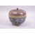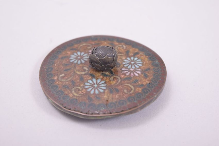 A JAPANESE CLOISONNE KORO AND COVER, decorated with panels of butterflies and flower heads beneath a band of foliate design and cockerels, supported three rounded feet, 12cm high.