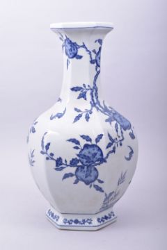 A LARGE CHINESE BLUE AND WHITE PORCELAIN HEXAGONAL VASE, decorated with peach blossom, the base with six character mark, 37cm high.