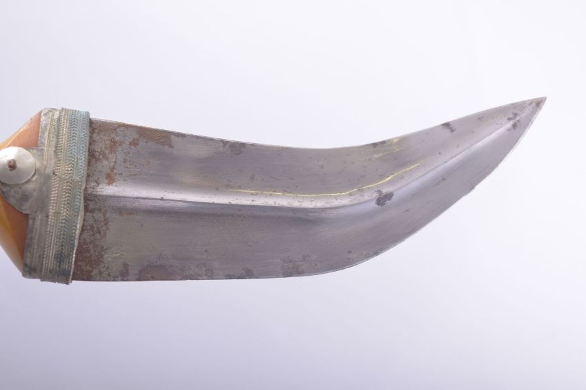 A RARE ISLAMIC ARAB JAMBIYA DAGGER, with gold mounted amber colour bakelite handle and original scabbard, 33cm overall.