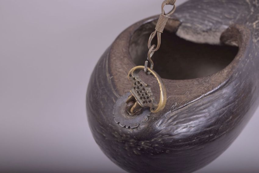 A SUPERB LARGE 19TH CENTURY COCO DE MER KASHKOOL, fitted with metal chain, 28cm long.