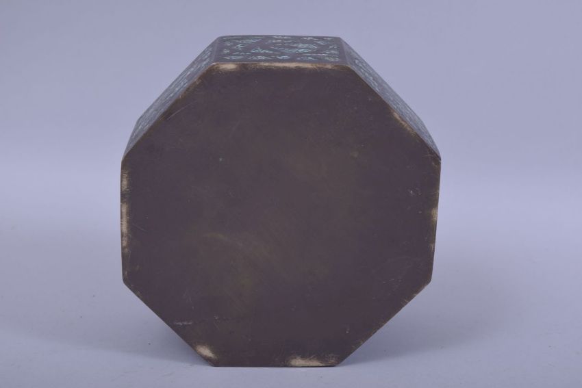 A FINE 19TH CENTURY INDIAN TURQUOISE INLAID BRASS OCTAGONAL LIDDED BOX, the turquoise inlay within a vine leaf pattern all over, 16.5cm diameter.