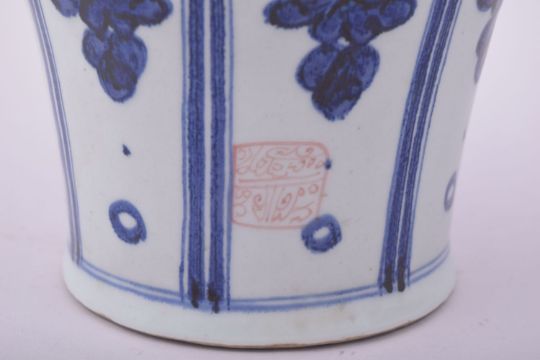 A LARGE CHINESE MING STYLE BLUE AND WHITE MEIPING VASE, the body painted with figures on horseback, 42cm high.