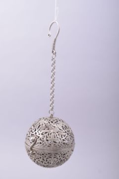 A CHINESE PIERCED WHITE METAL INCENSE BURNER on chain.