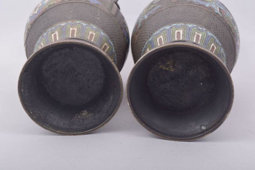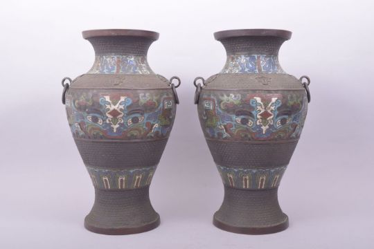 A LARGE PAIR OF CHINESE CHAMPLEVE ENAMEL BRONZE VASES with twin ring handles, the body of each with three bands of champleve enamel decoration, each 36cm high.