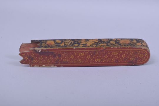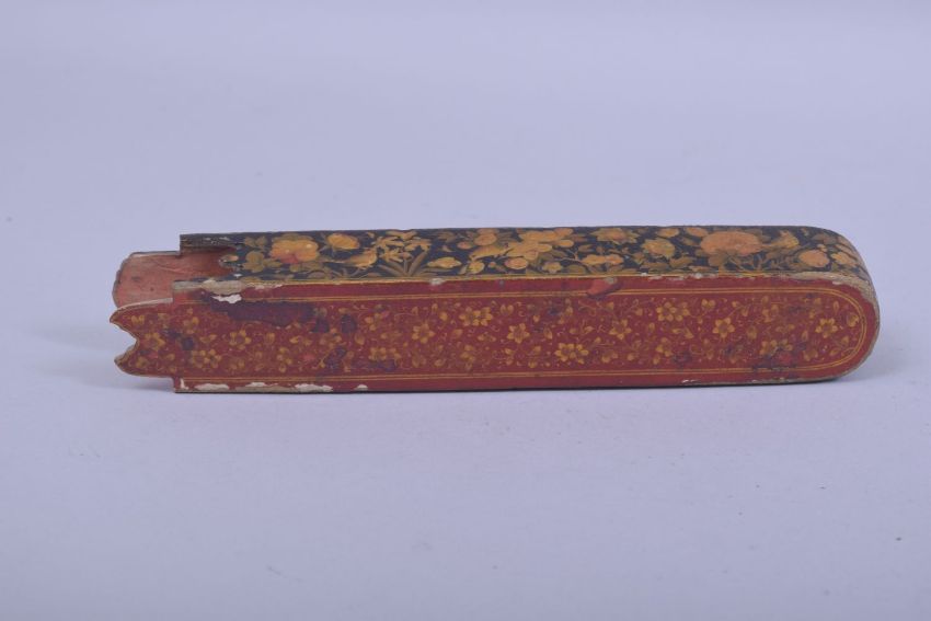 A 19TH CENTURY PERSIAN QAJAR LACQUERED PAPIER MACHE QALAMDAN PEN BOX, with floral decoration, 23.5cm long.