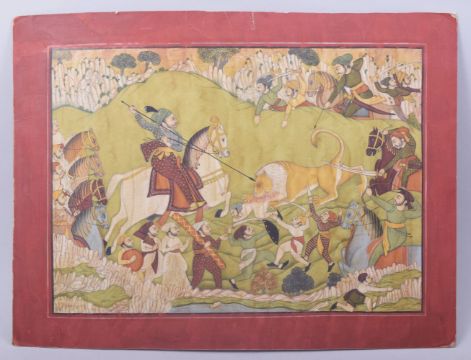A LARGE INDIAN MINIATURE PAINTING ON PAPER, depicting soldiers fending off a predatory attack, unframed, 32cm x 42cm.