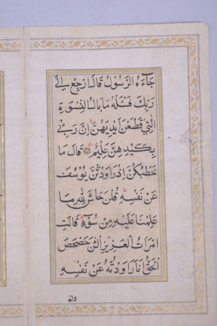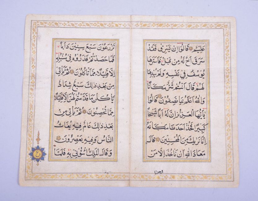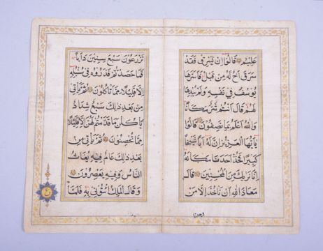 AN 18TH/19TH CENTURY ISLAMIC FINE QUALITY QURAN PAGE, with two double sided leaves of fine calligraphy, washed with gold with floral gilt borders, with a signature and a coloured emblem, each leaf 11.5cm x 18.5cm.